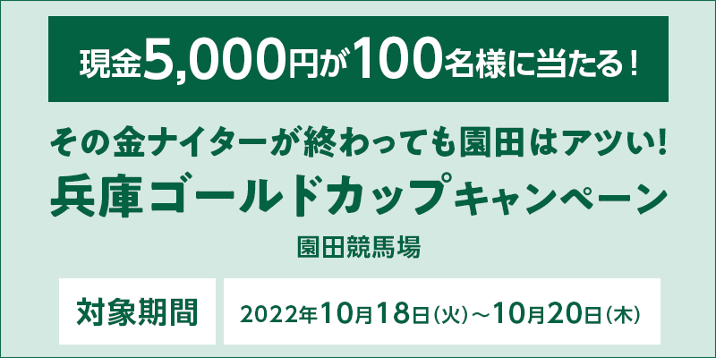 2022年10月18日(火)〜10月20日(木)に開催される園田競馬の勝馬投票券(重勝式を除く)をオッズパークで合計5,000円以上購入し、キャンペーンに応募いただいた方の中から抽選で、現金5,000円を100名様にプレゼントいたします。