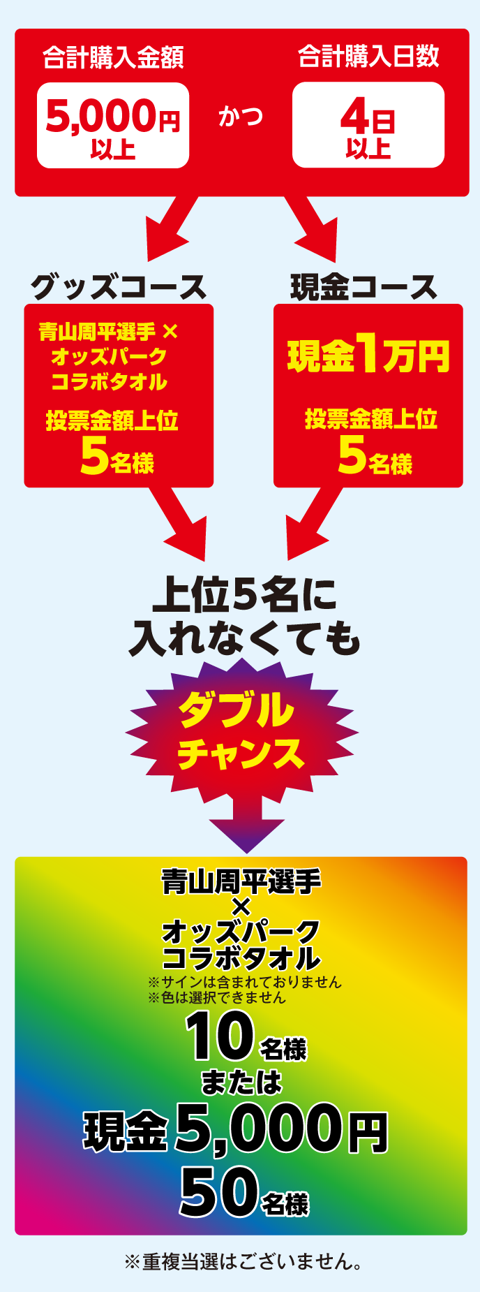 3.またダブルチャンスとして、外れた方の中から抽選で青山周平選手×オッズパークコラボタオルを10名様、現金5,000円を50名様にプレゼントいたします。