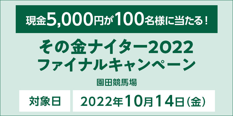 2022年10月14日(金)に開催される園田競馬の勝馬投票券(重勝式を除く)をオッズパークで合計5,000円以上購入し、キャンペーンに応募いただいた方の中から抽選で、現金5,000円を100名様にプレゼントいたします。