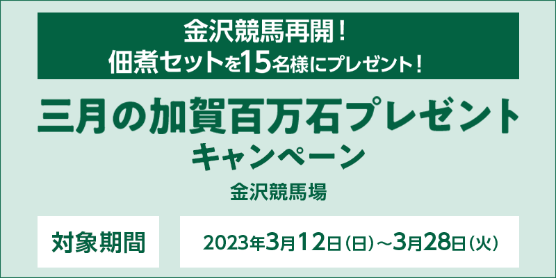 【金沢競馬】三月の加賀百万石プレゼントキャンペーン 対象期間 2023年3月12日(日)〜3月28日(火) 対象場 金沢競馬場 金沢競馬再開!佃煮セットを15名様にプレゼント!