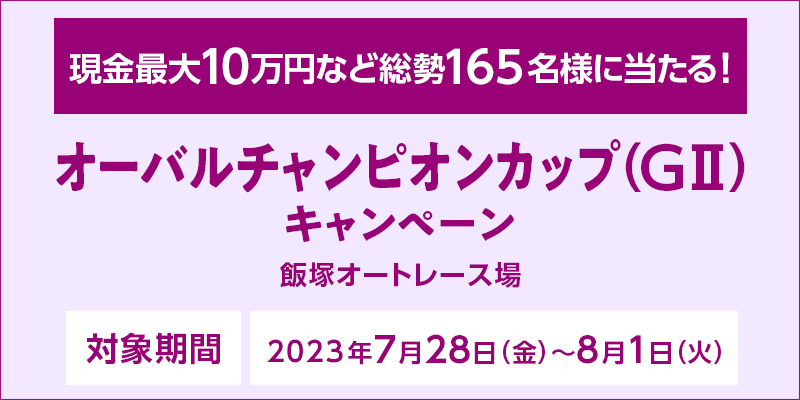 2023年7月28日(金)~8月1日(火)に開催される飯塚オートレースの勝車投票券(重勝式を含む)をオッズパークで合計5,000円以上購入し、キャンペーンに応募いただいた方の中から抽選で、現金10万円、現金1万円、オーバルチャンピオンカップ(GII)オリジナルQUOカード(500円分)などを合計165名様にプレゼントいたします。