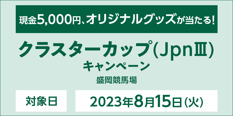 2023年8月15日(火)に開催される岩手競馬の勝馬投票券(重勝式を含む)をオッズパークで合計3,000円以上購入し、キャンペーンに応募いただいた方の中から抽選で、現金5,000円を100名様、岩手競馬オリジナルフードボックスを10名様にプレゼントいたします。