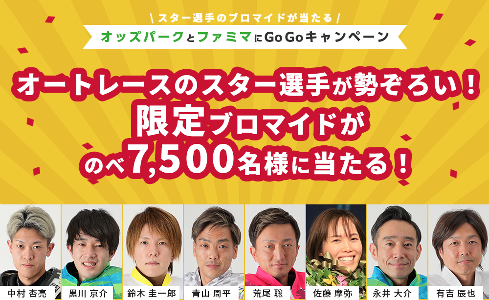 各対象期間中に開催される地方競馬・競輪・ガールズケイリン・オートレースの投票券(重勝式を含む)をオッズパークで各対象期間内に合計1,000円以上購入し、キャンペーンに応募いただいた方の中から抽選で、各期間2,500名様(3期間でのべ7,500名様)にオートレース選手のブロマイドをプレゼントいたします。