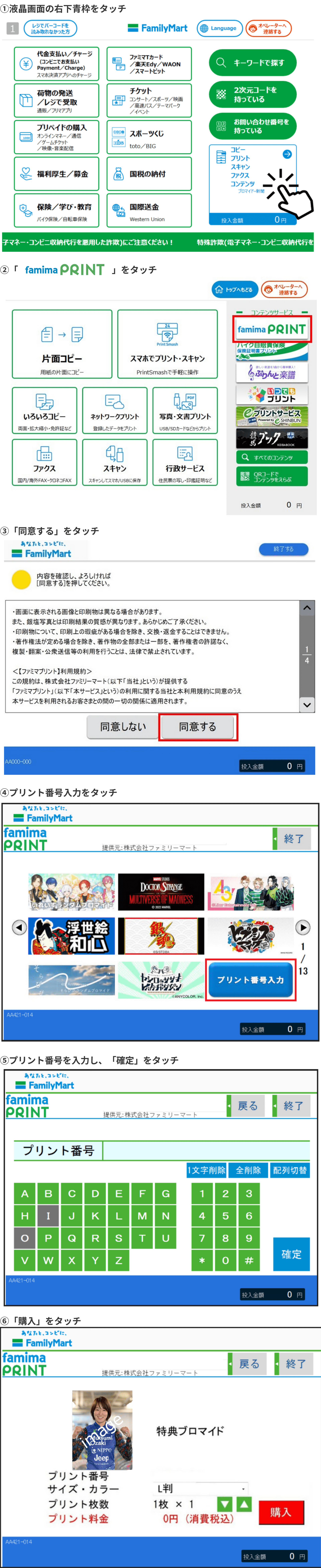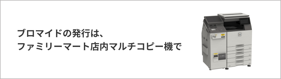 ・本キャンペーンの景品であるブロマイドは株式会社ファミリーマートの保有するファミマプリントというサービスを利用し、マルチコピー機が設置されている全国のファミリーマートで発行いただけます。※一部店舗を除く