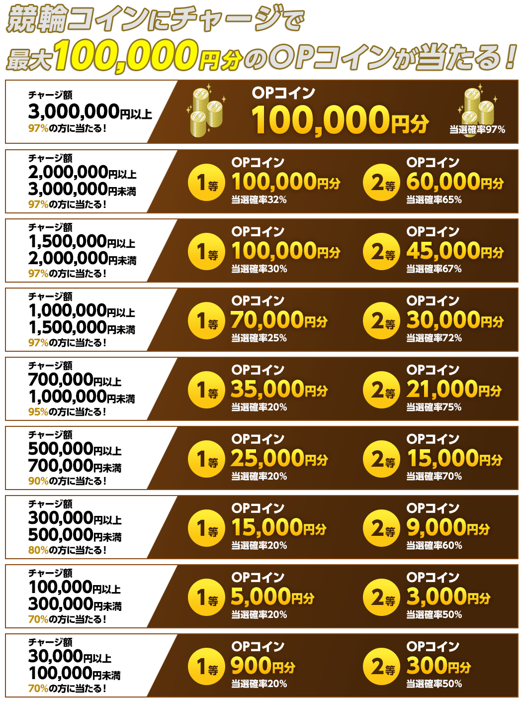 - キャンペーンは、対象期間中にオッズパーク内で指定の金額以上、競輪コインにチャージいただいた方を対象とします。