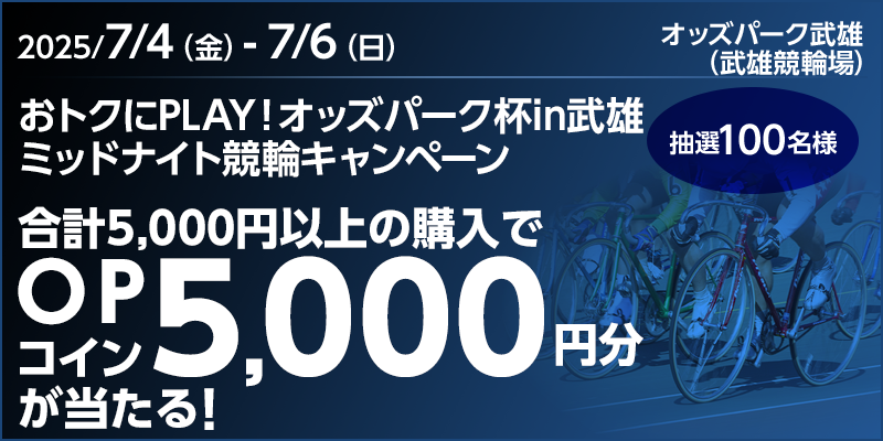 対象期間中に開催される、武雄競輪の勝者投票券(重勝式を含む)をオッズパークで合計5,000円以上購入すること。