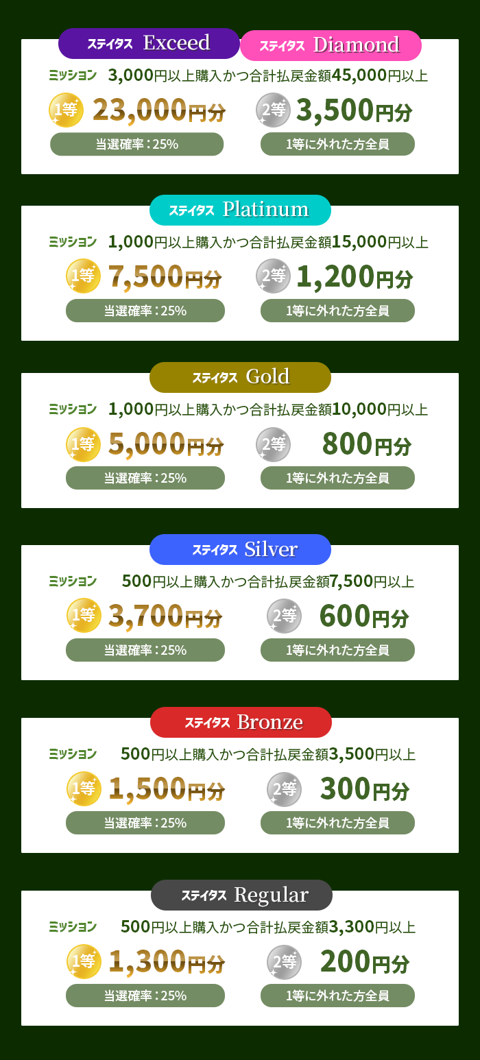 ※1等(当選確率25%)・2等(1等に外れた方全員)の抽選は、ステイタスごとに実施します。