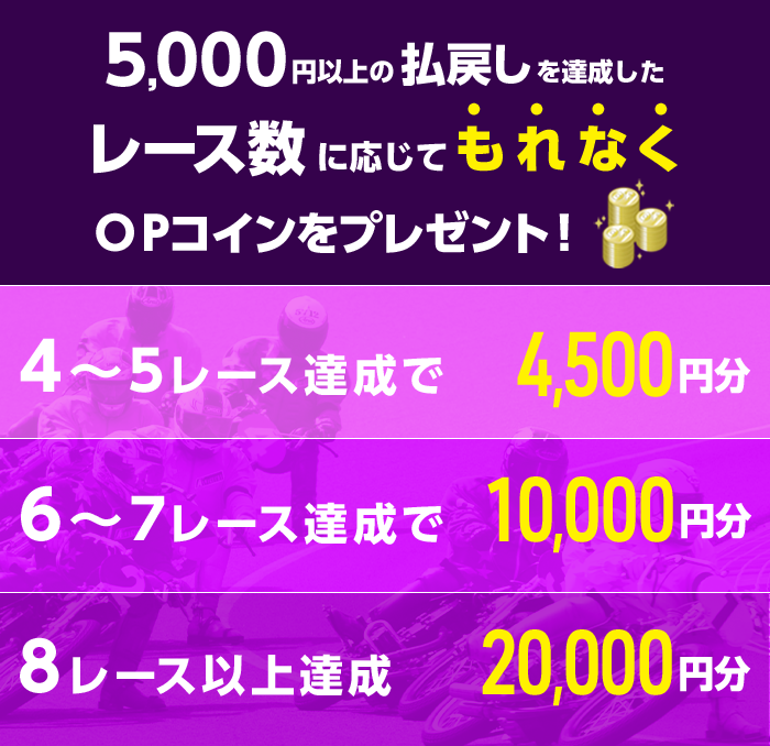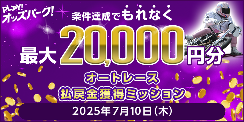 対象日に開催される、オートレースの勝車投票券(2連単・2連複・3連単・3連複)をオッズパークで合計1,000円以上購入し、かつ1レースあたり合計5,000円以上の払戻しを4レース以上で達成すること。