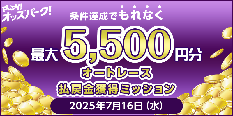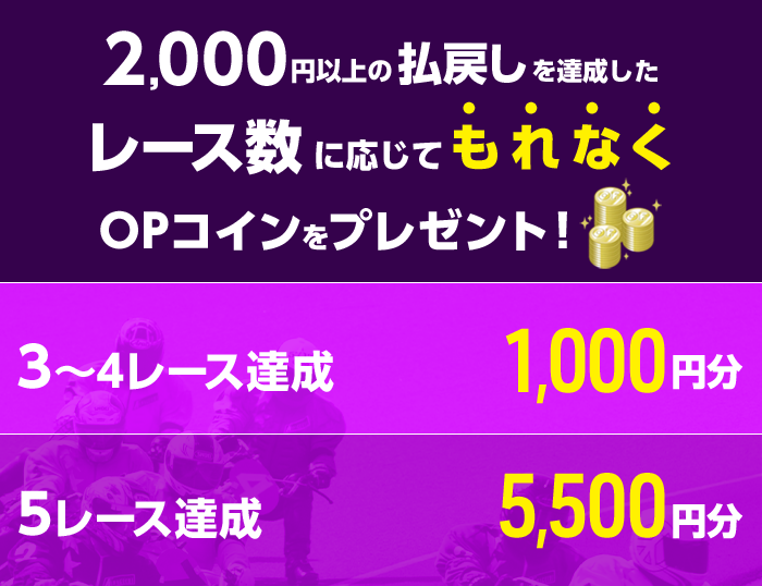 - 競走が不成立、開催中止、順延、または選手の欠場などで返金となった場合、その投票はキャンペーンの対象外となります。また、その場合でも、原則としてキャンペーン期間の延長や条件変更は行わず、記載の内容に従って実施いたします。