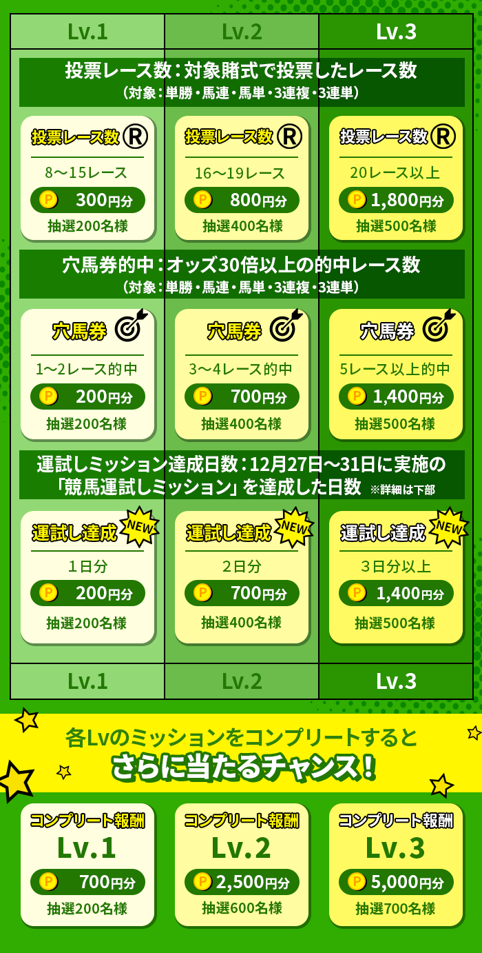 - (C)12月27日~31日実施の「競馬 運試しミッション」を1日分以上達成