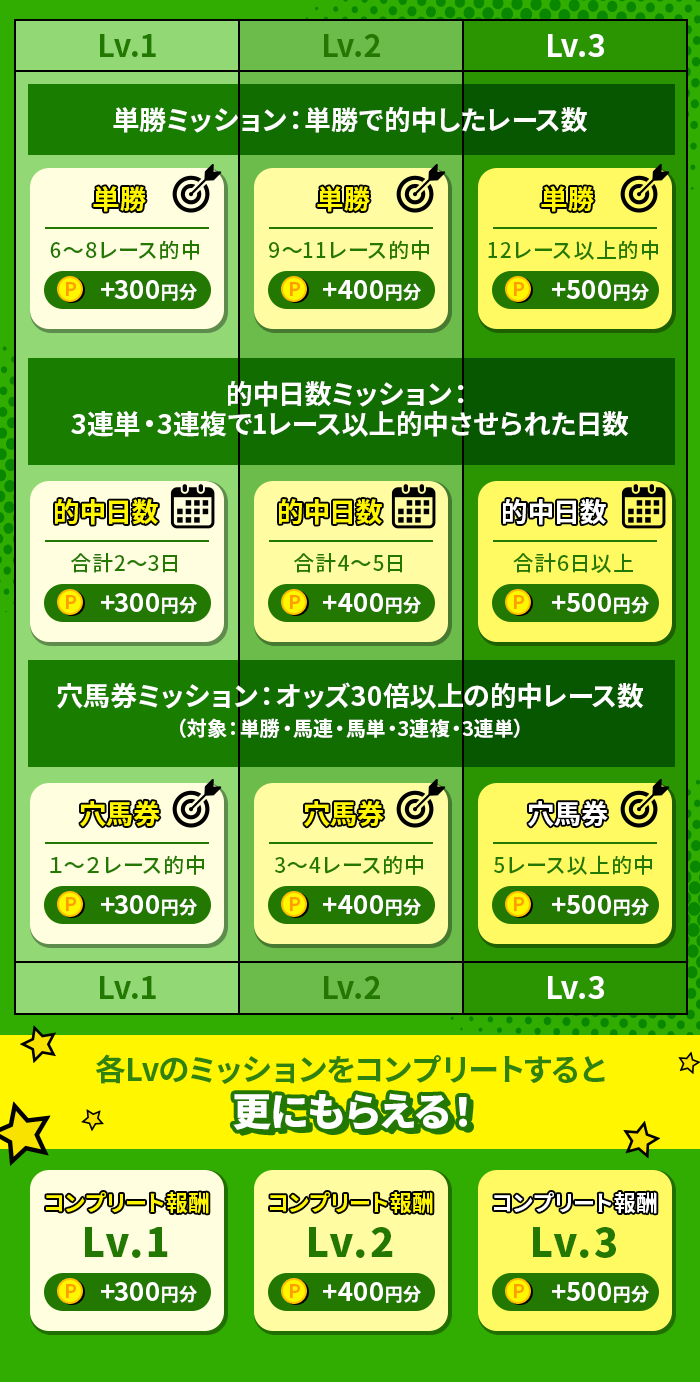 ※確定したオッズによっては、穴馬券ミッションの条件が達成できなくなる場合がございます。
