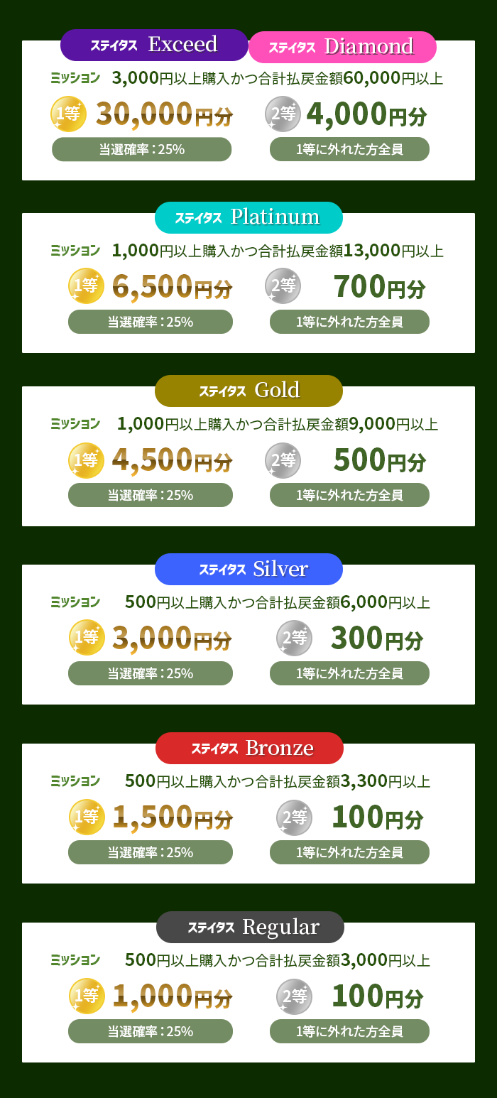 ※1等(当選確率25%)・2等(1等に外れた方全員)の抽選は、ステイタスごとに実施します。