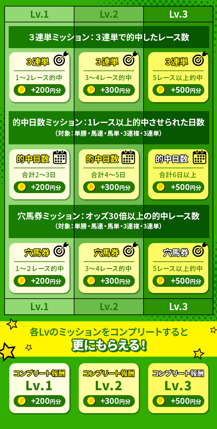 - 競走が不成立、開催中止、順延、または選手の欠場などで返金となった場合、その投票はキャンペーンの対象外となります。また、その場合でも、原則としてキャンペーン期間の延長や条件変更は行わず、記載の内容に従って実施いたします。
