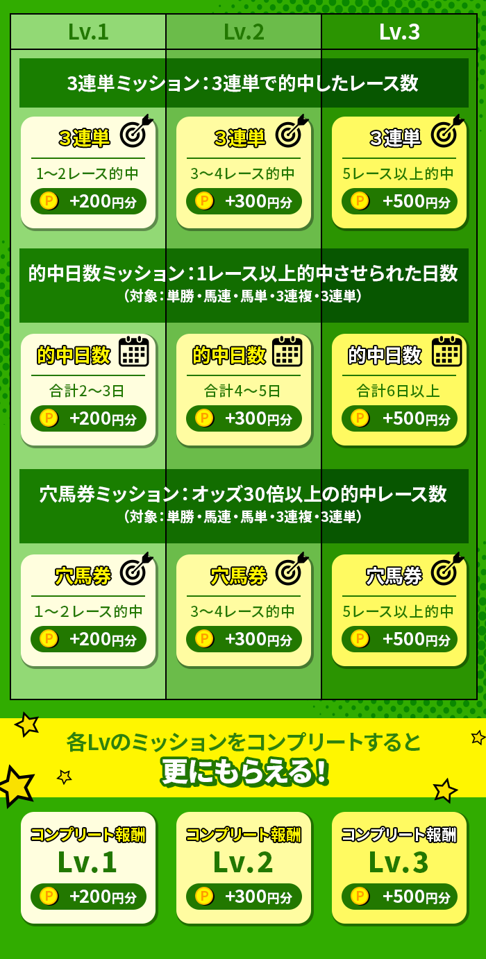 - 競走が不成立、開催中止、順延、または選手の欠場などで返金となった場合、その投票はキャンペーンの対象外となります。また、その場合でも、原則としてキャンペーン期間の延長や条件変更は行わず、記載の内容に従って実施いたします。