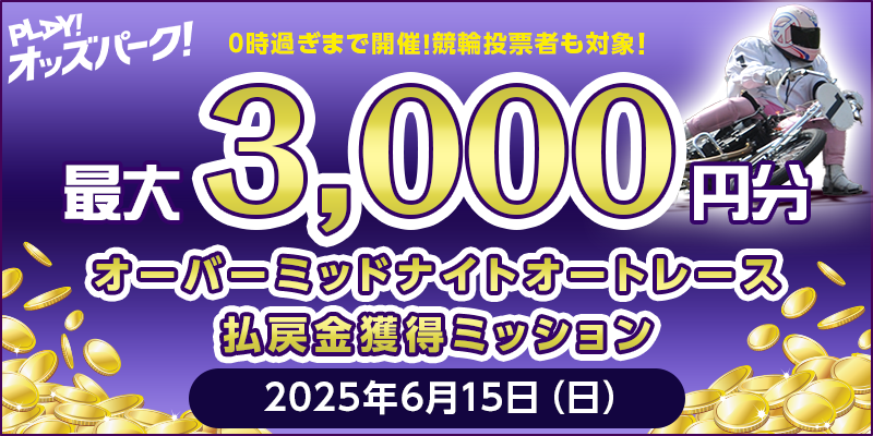 対象日に開催される、競輪・オートレースのいずれか、または両方の投票券(ワイド・重勝式を除く)をオッズパークで合計200円以上購入し、かつ山陽オートレースの後半2レース(第7レース・第8レース)で1レースあたり合計3,000円以上の払戻しを達成すること。