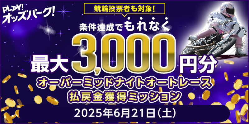 対象日に開催される、競輪・オートレースのいずれか、または両方の投票券(ワイド・重勝式を除く)をオッズパークで合計200円以上購入し、かつ山陽オートレースの後半2レース(第7レース・第8レース)のいずれかで1レースあたり合計3,000円以上の払戻しを達成すること。