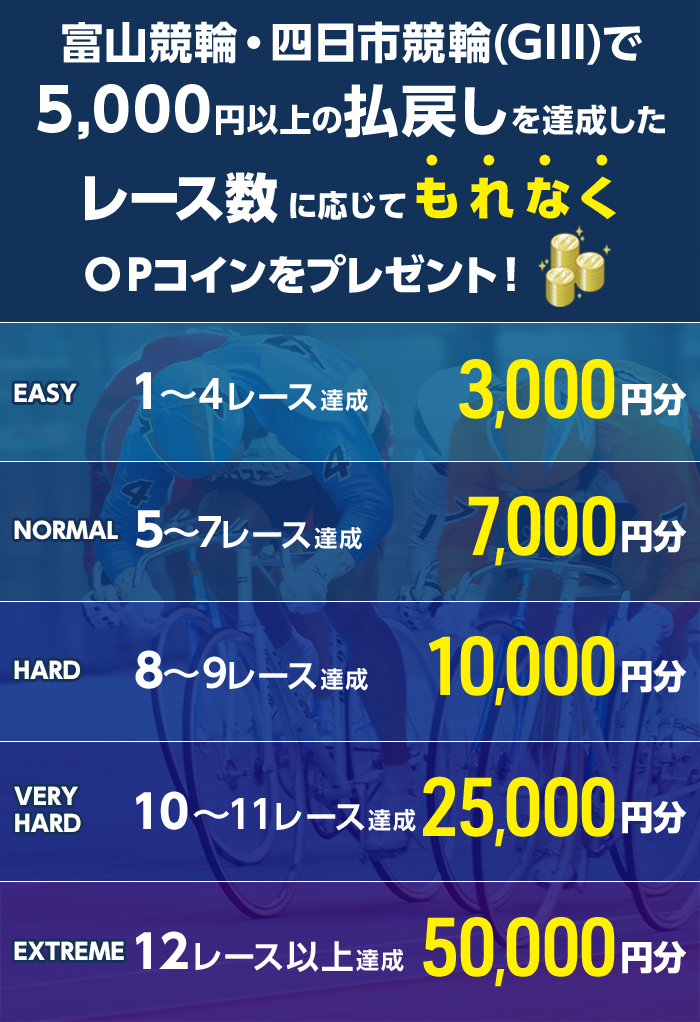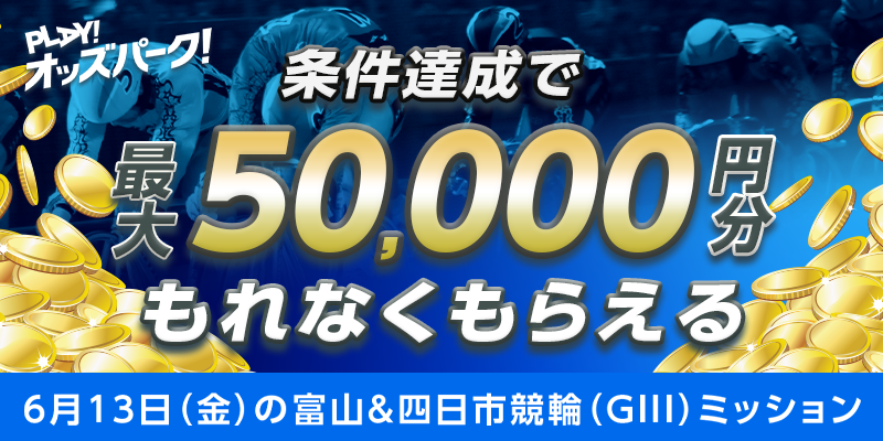対象日に対象場(富山競輪・四日市競輪)で開催される、競輪の勝者投票券(ワイド・重勝式を除く)をオッズパークで合計3,000円以上購入し、かつ1レースあたり合計5,000円以上の払戻しを達成すること。