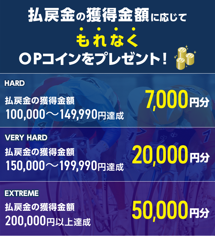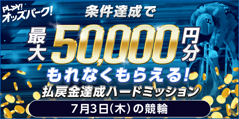 対象日に開催される、競輪の勝者投票券(2車複・2枠複・ワイド・重勝式を除く)をオッズパークで合計5,000円以上購入し、かつ合計100,000円以上の払戻しを達成すること。