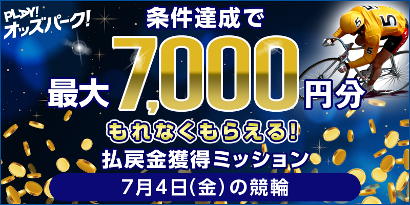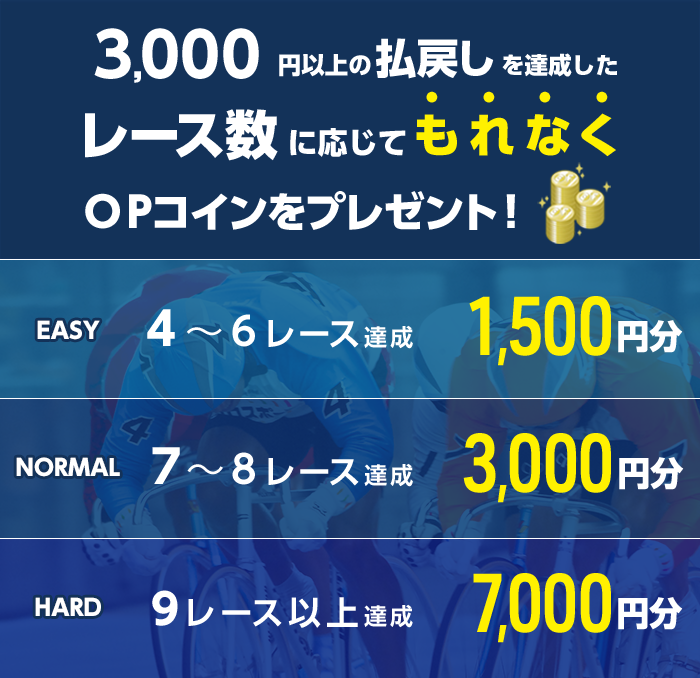 対象日に開催される、競輪の勝者投票券(ワイド・重勝式を除く)をオッズパークで合計2,000円以上購入し、かつ1レースあたり合計3,000円以上の払戻しを4レース以上で達成すること。
