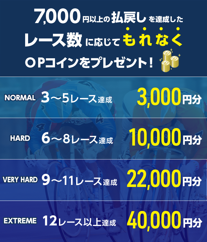 対象日に開催される、競輪の勝者投票券(ワイド・重勝式を除く)をオッズパークで合計3,000円以上購入し、かつ1レースあたり合計7,000円以上の払戻しを3レース以上で達成すること。