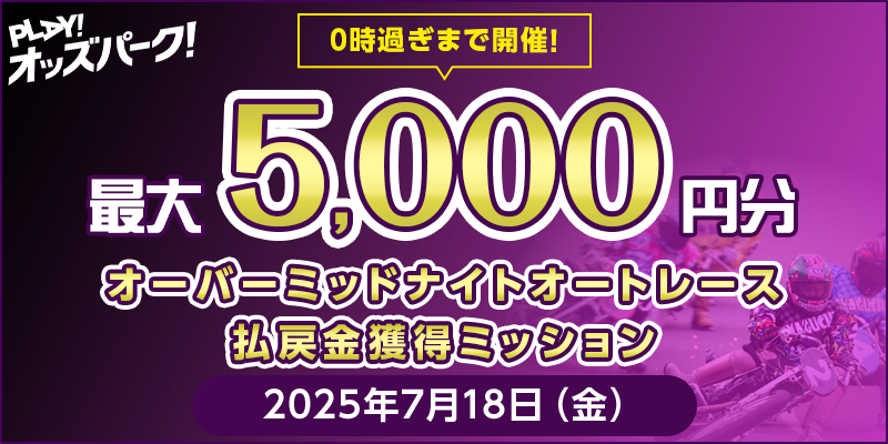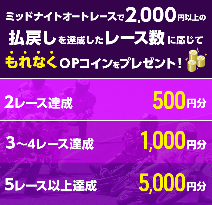 対象日に開催される、オートレースの勝車投票券(単勝・ワイド・重勝式を除く)をオッズパークで合計300円以上購入し、かつミッドナイトオートレースで1レースあたり合計2,000円以上の払戻しを2レース以上で達成すること。