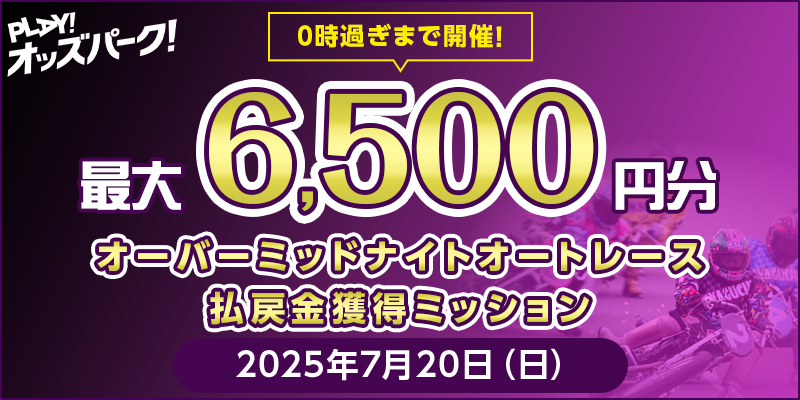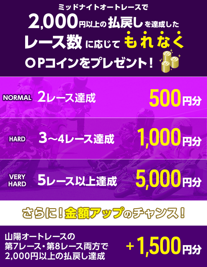 対象日に開催される、オートレースの勝車投票券(2連単・2連複・3連単・3連複)をオッズパークで合計400円以上購入し、かつミッドナイトオートレースで1レースあたり合計2,000円以上の払戻しを2レース以上で達成すること。