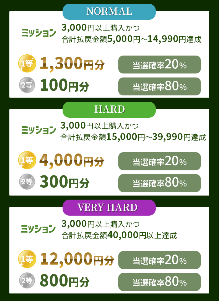 ※条件達成者の人数によっては端数処理の影響により、実際の当選確率と表記上の数値が一致しない場合があります。