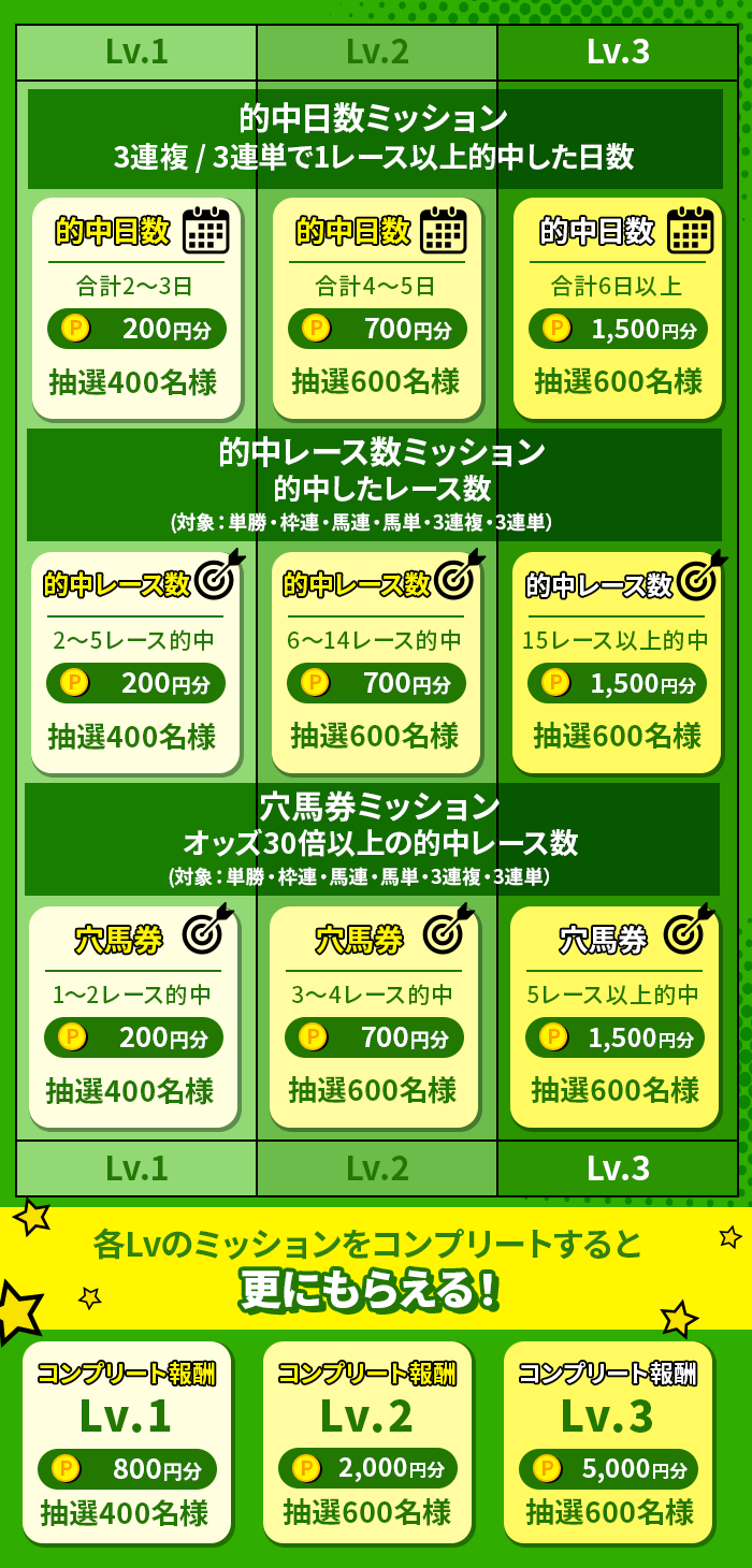 ※確定したオッズによっては、穴馬券ミッションの条件が達成できなくなる場合がございます。