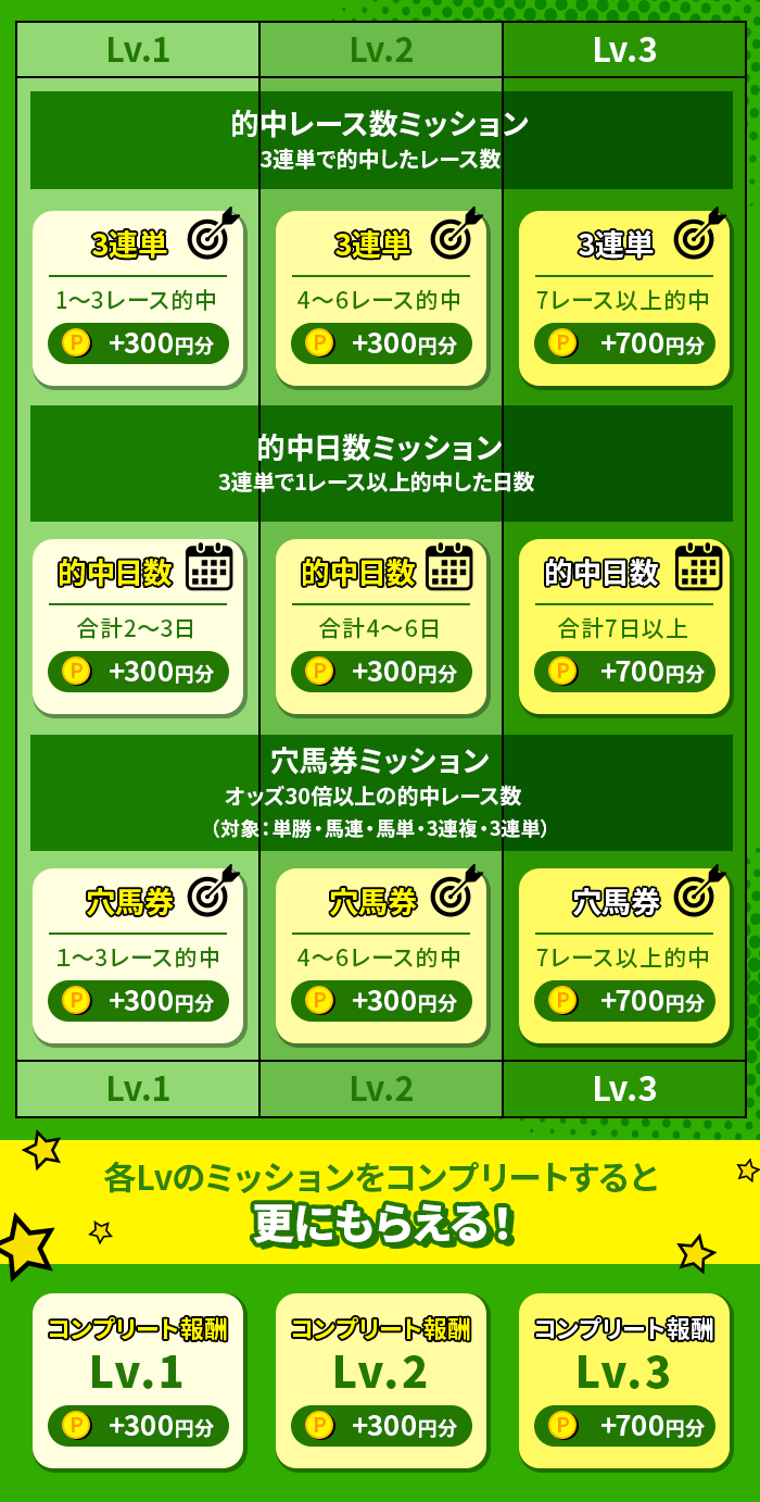※確定したオッズによっては、穴馬券ミッションの条件が達成できなくなる場合がございます。