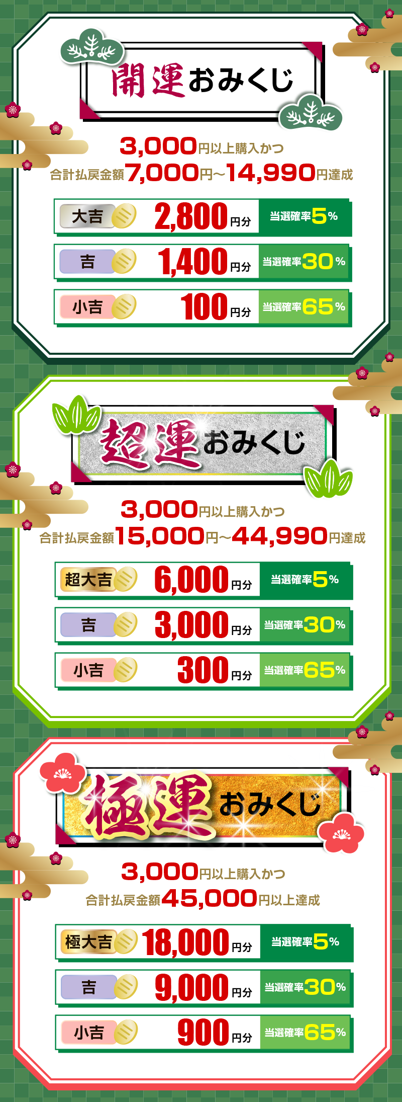 - おみくじ結果の決定方法については、条件達成者に対して厳正なる抽選を実施の上、決定させていただきます。