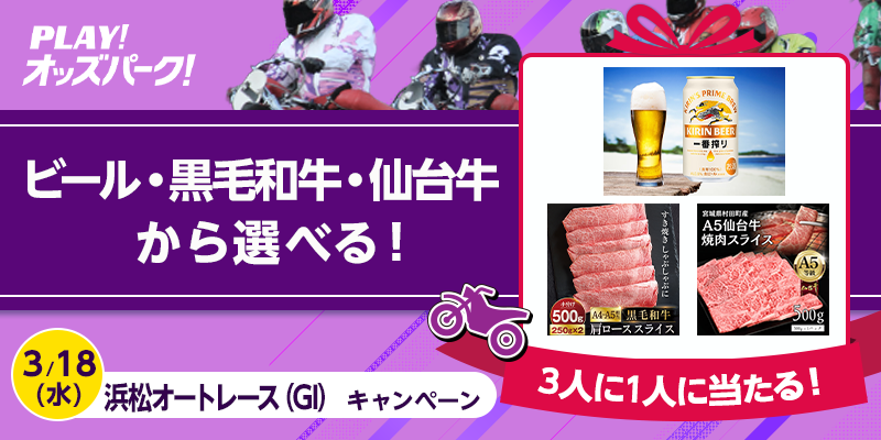 対象日に開催される、浜松オートレースの勝車投票券(単勝・複勝・ワイドを除く)をオッズパークで合計10,000円以上購入すること。