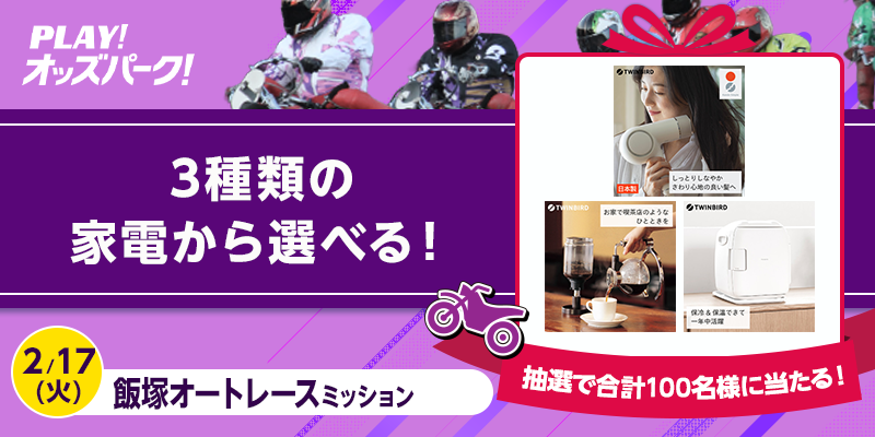 対象日に開催される、飯塚オートレースの勝車投票券(単勝・複勝・ワイドを除く)をオッズパークで合計12,000円以上購入すること。