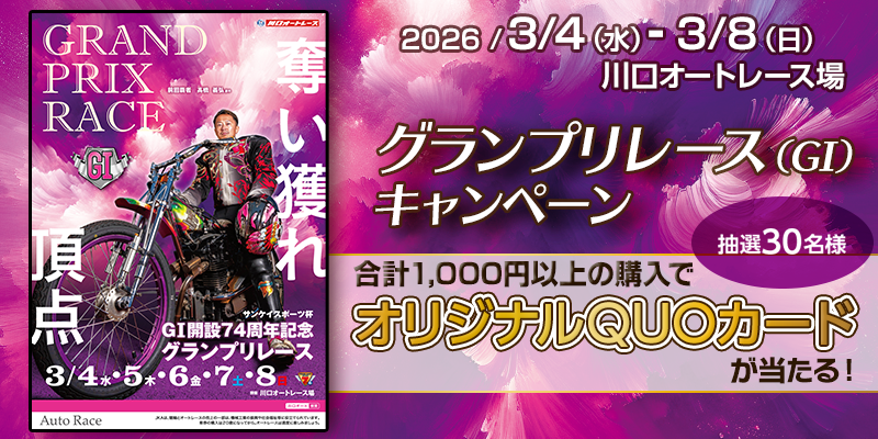 ※諸事情により「川口オートレースオリジナルQUOカード」は内容が変更となる可能性がございますので、あらかじめご了承ください。