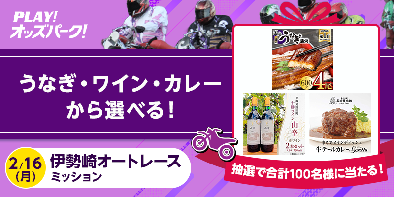 対象日に開催される、伊勢崎オートレースの勝車投票券(単勝・複勝・ワイドを除く)をオッズパークで合計10,000円以上購入すること。