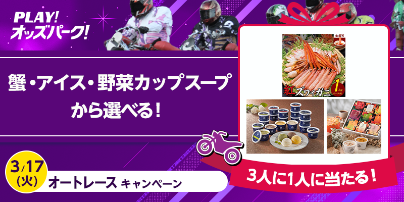 対象日に開催される、オートレースの勝車投票券(単勝・複勝・ワイドを除く)をオッズパークで合計12,000円以上購入すること。