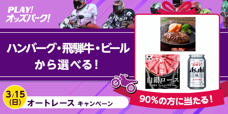 対象日に開催される、オートレースの勝車投票券(単勝・複勝・ワイドを除く)をオッズパークで合計15,000円以上購入すること。