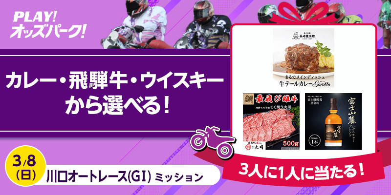 対象日に開催される、川口オートレースの勝車投票券(単勝・複勝・ワイドを除く)をオッズパークで合計12,000円以上購入すること。