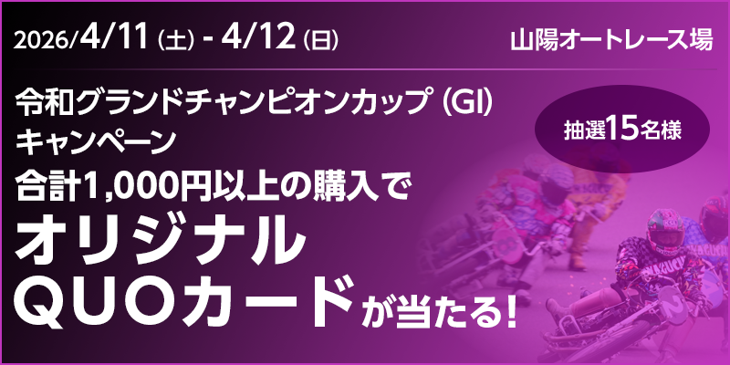 ※諸事情により賞品の「山陽オートレースオリジナルQUOカード(500円分)」は内容が変更となる可能性がございますので、あらかじめご了承ください。
