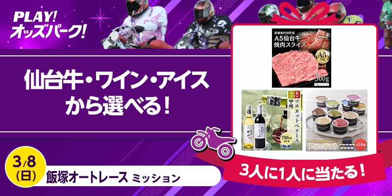 対象日に開催される、飯塚オートレースの勝車投票券(単勝・複勝・ワイドを除く)をオッズパークで合計12,000円以上購入すること。