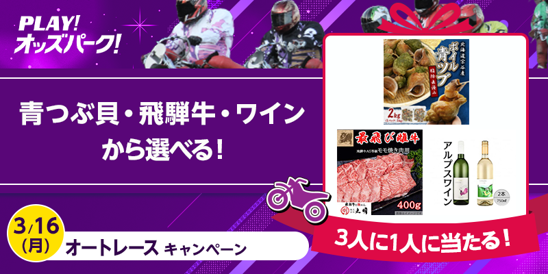 対象日に開催される、オートレースの勝車投票券(単勝・複勝・ワイドを除く)をオッズパークで合計12,000円以上購入すること。