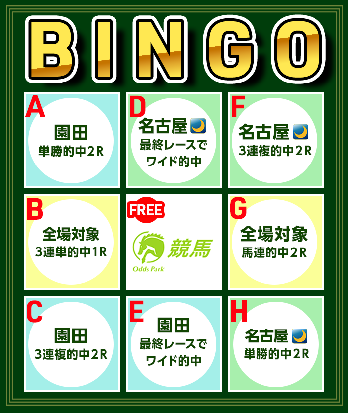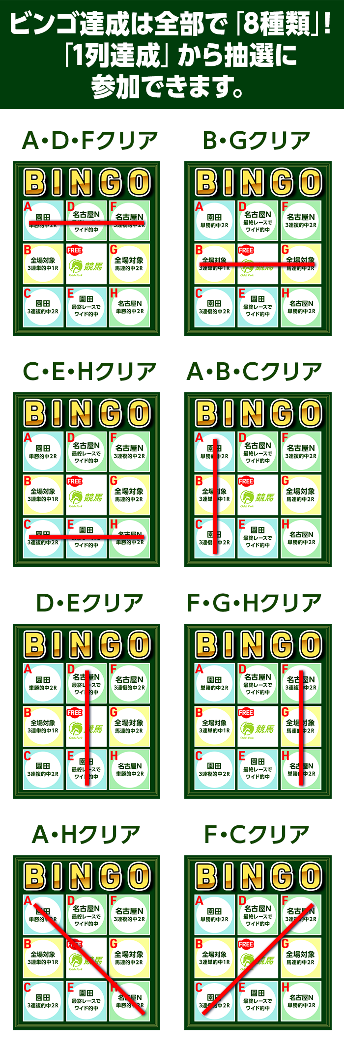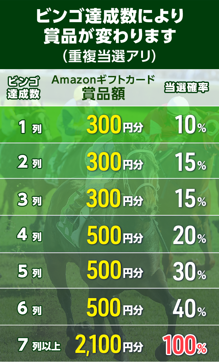 キャンペーン期間中に「競馬ビンゴ」を達成させること。