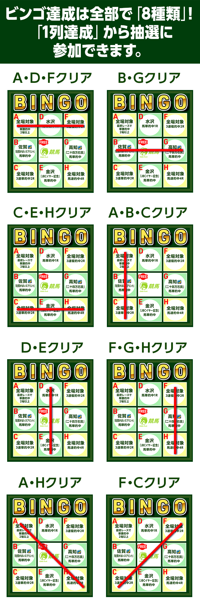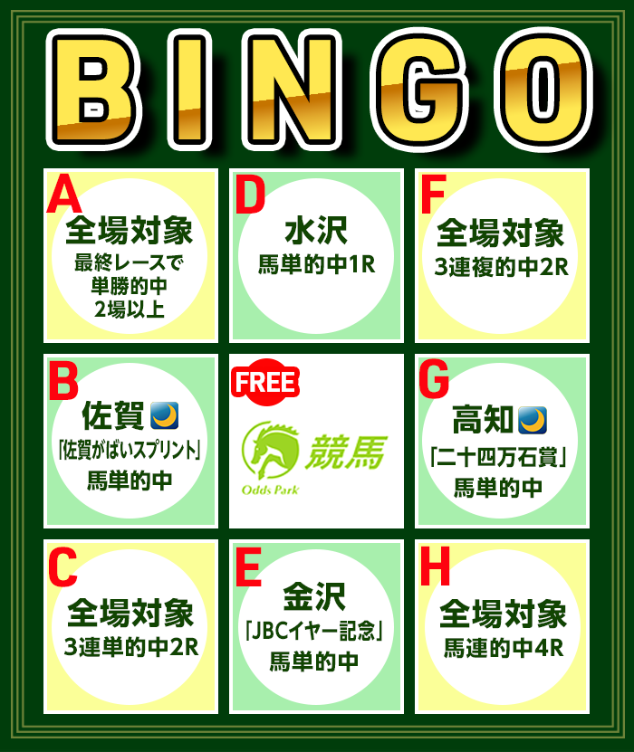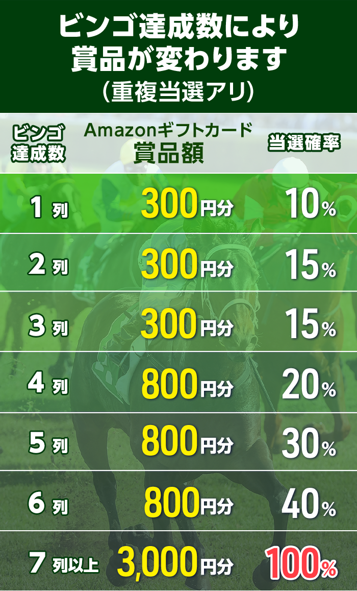 キャンペーン期間中に「競馬ビンゴ」を達成させること。