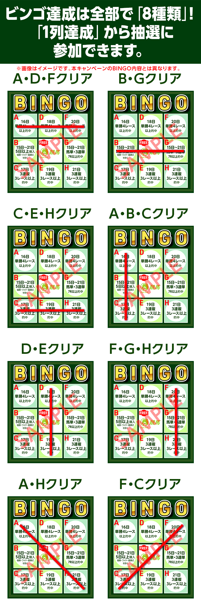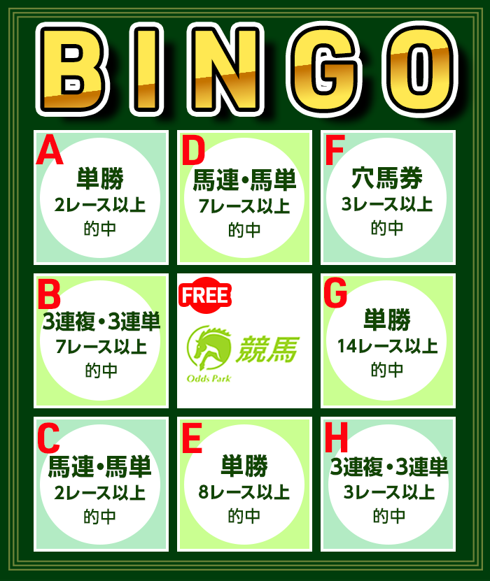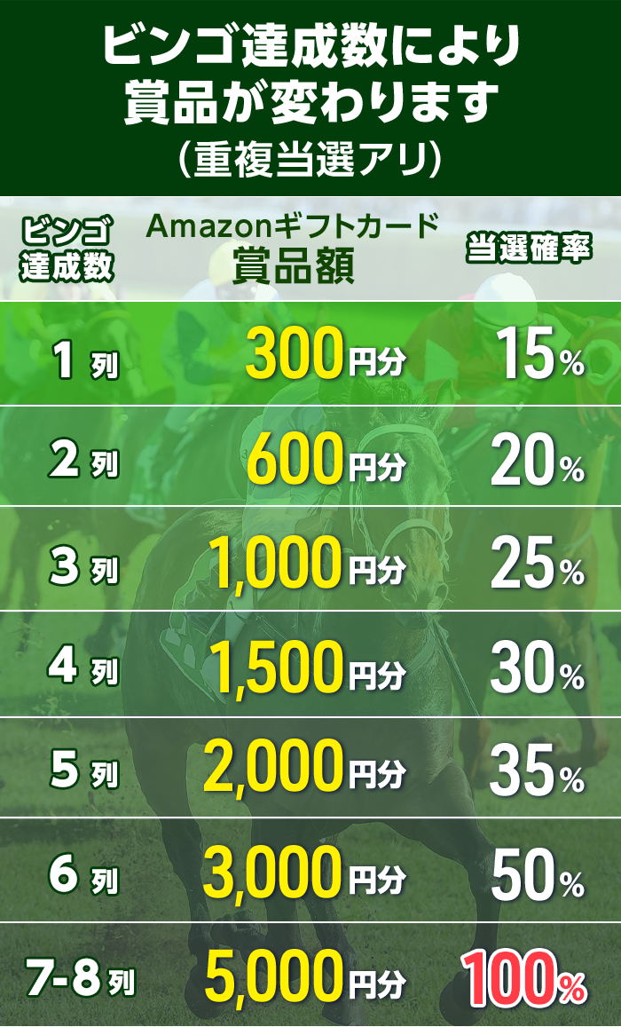 キャンペーン期間中に「競馬ビンゴ」を達成させること。