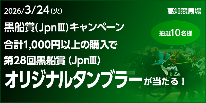 賞品の「第28回黒船賞(JpnIII)オリジナルタンブラー」「土佐あかうしふりかけ」はキャンペーン対象期間終了後、1か月~2か月程度での発送を予定しております。