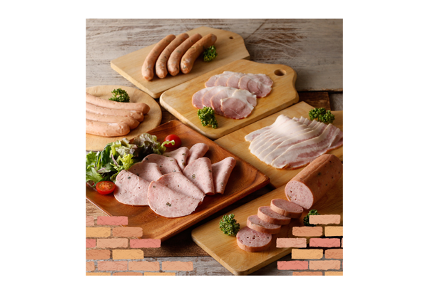 【内容量:ポークソーセージ160g×1、ウィンナーソーセージ(行者ニンニク入)160g×1、リオナソーセージ(マッシュルーム入)250g×1、リオナ(スライス)100g×1、ボンレスハム(スライス)70g×1、ベーコン(スライス)100g×1】