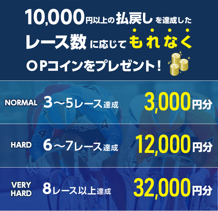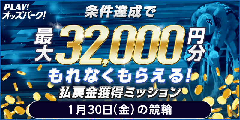 - 競走が不成立、開催中止、順延、または選手の欠場などで返金となった場合、その投票はキャンペーンの対象外となります。また、その場合でも、原則としてキャンペーン期間の延長や条件変更は行わず、記載の内容に従って実施いたします。