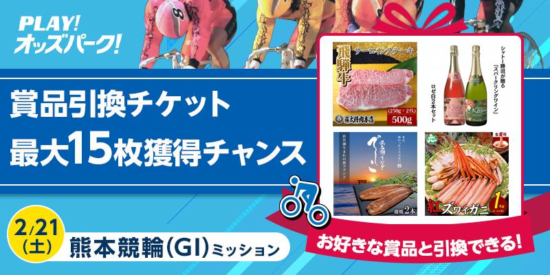 対象日に開催される、熊本競輪の勝者投票券(ワイドを除く)をオッズパークで合計35,000円以上購入すること。