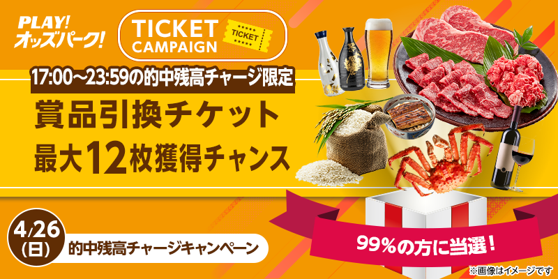 2026年4月26日(日)17:00~23:59に的中残高からのチャージまたは的中チャージにて、OPコインに合計100,000円以上チャージ