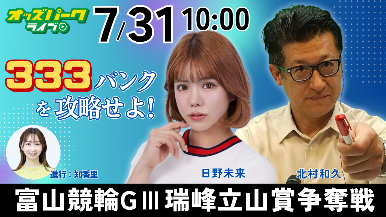 初日は競輪車券研究において定評のある北村和久さん(元選手)をお迎えし、日野未来さん(元ガールズ選手)と「333バンク」攻略に挑みます。
